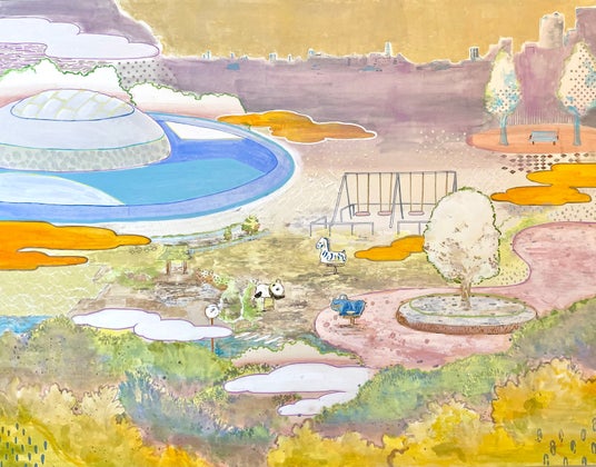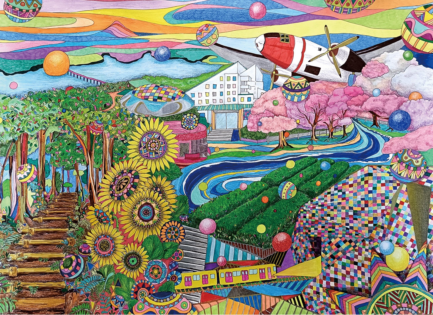 【作品コンセプト】光を受けて建物や遊具、植物が色を放つようすを多彩に表現しました。幼い頃遊んだ公園や球場をモチーフに「ところざわのまち」の思い出を重ね、点在する風景が記憶の中でつながり円のように広がるイメージを遊ぶように行き来しながら一つの大きな風景にしました。