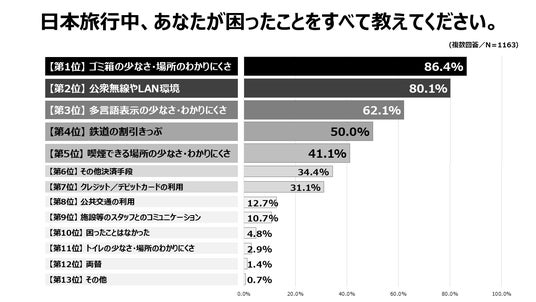 前回調査から「ゴミ箱不足」86.4%が急浮上。「Wi-Fi環境」は80.1%で高止まり、喫煙者は「喫煙所不足」96.0%――3大不足インフラが判明