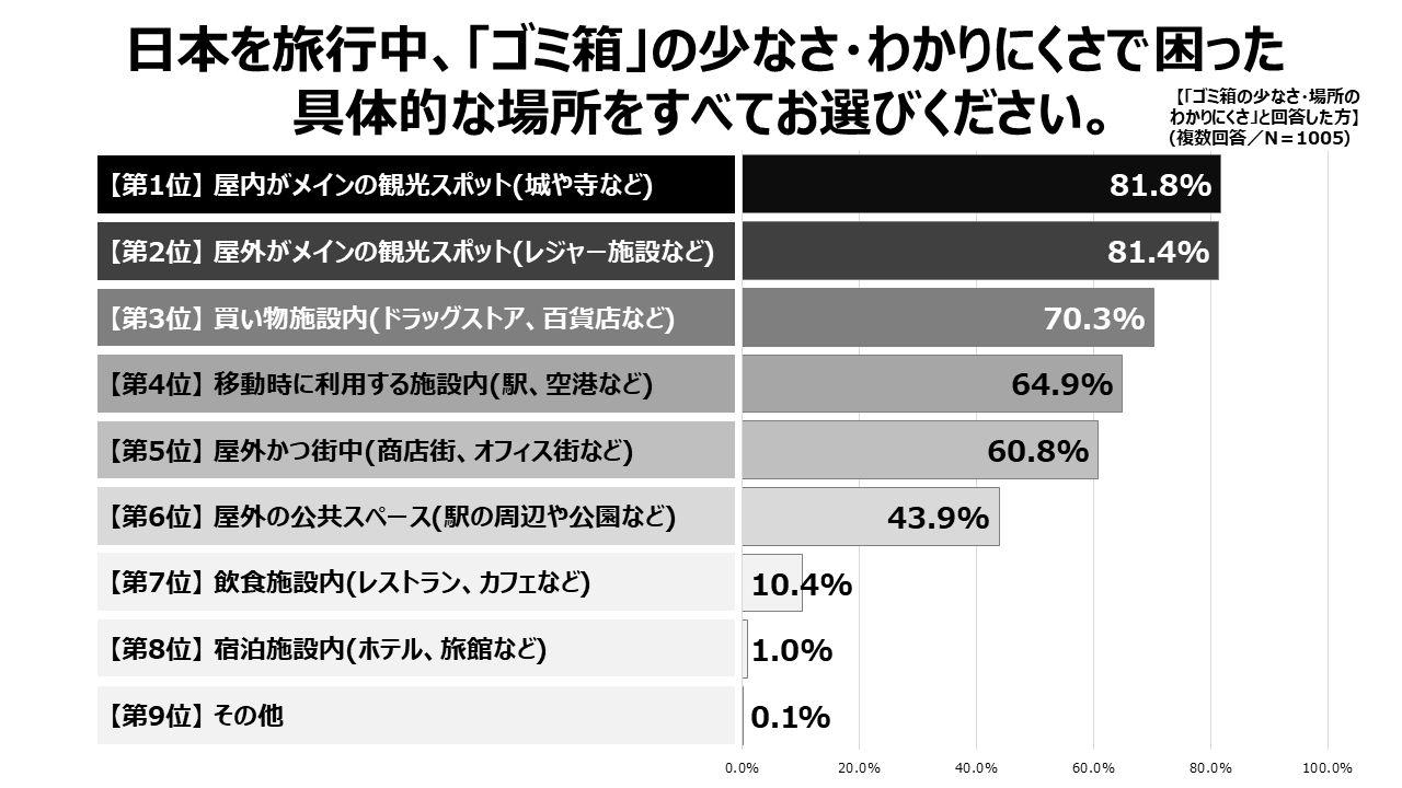 ■ゴミ箱不足、困った場所は“観光スポットの屋内外”が7割超