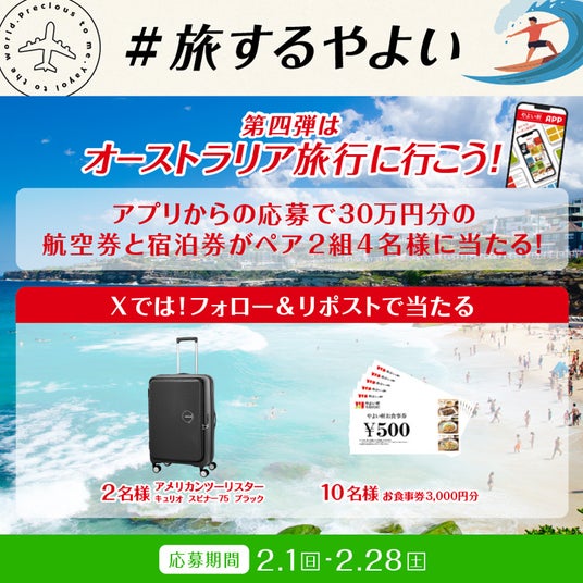 株式会社プレナスは、定食レストラン「やよい軒」を、日本国内にて2025年12月末現在365店舗・海外において約250店舗展開しております。このたび日本国内の「やよい軒」では、「やよい軒」公式アプリにおいて、 世界のやよい軒をめぐるプロモーションを開催します。「#旅するやよい」をテーマに第四弾はオーストラリアをご紹介いたします。2月1日(日)より、アプリで応募するとオーストラリア旅行をペア2組4名様に抽選でプレゼントします。ぜひ、この機会にご応募ください。