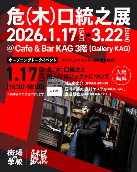 「危(木)口統之展+搬入プロジェクト倉敷計画」実行委員会(代表:木口賀之)は、街場の学校・KAGアート事業の一環として、倉敷市出身の演出家・アーティストである危口統之(きぐち・のりゆき/1975-2017/本名 木口統之)の活動を振り返る個展『危(木)口統之展』を、2026年1月17日(土)より開催しております。