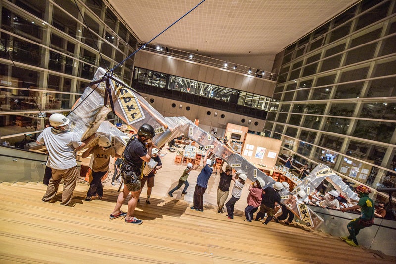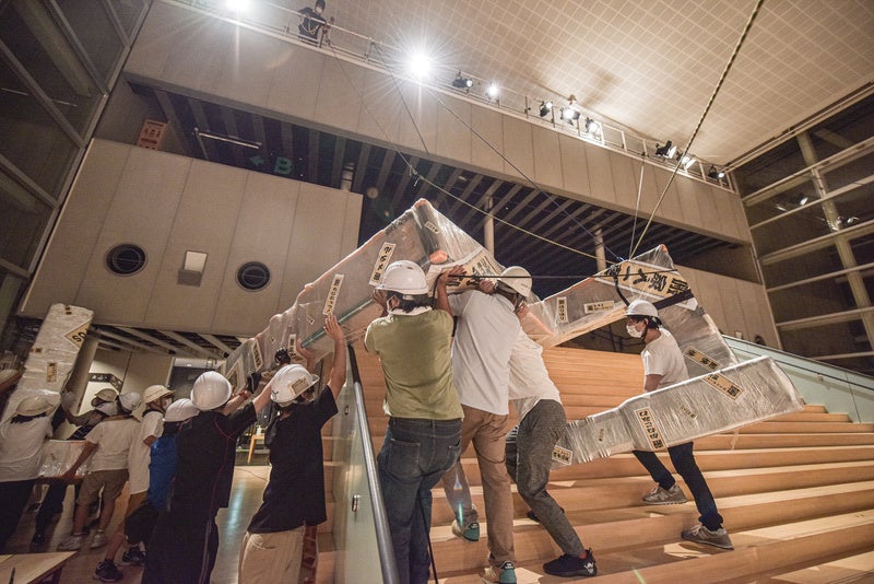 2.メインイベント:『搬入プロジェクト 倉敷計画』「搬入プロジェクト」は、建物の形状に合わせて設計された「空間に収まりきらないように見えて、ギリギリ入る物体」を、多くの人の手で協力して搬入するパフォーマンス作品です。倉敷駅前の「倉敷ビオス憩いの広場」を出発し、商店街を抜け、会場である「KAG」の1階へ搬入を行います。飛び入り参加も可能な、祝祭的なイベントです。