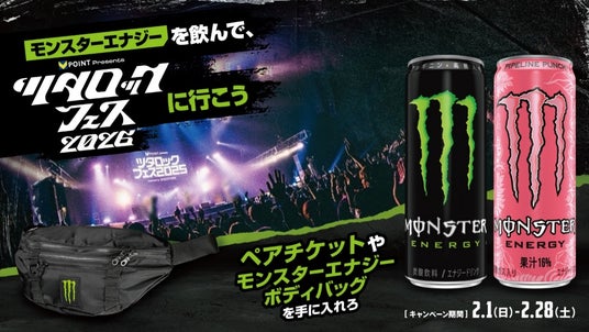 国内No.1エナジードリンク(※)のモンスターエナジーは、 2026年2月1日(日)~2月28日(土)の期間、CEミュージッククリエイティブ株式会社が主催する屋内型の音楽フェス「ツタロックフェス2026」のペアチケットなどが当たるキャンペーン「モンスターエナジーを飲んで、Vポイント presents ツタロックフェス2026に行こう」を開催いたします。
