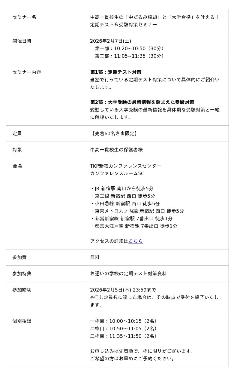 そこで本セミナーでは、具体的な「定期テスト対策」と、最新の大学受験情報を元にした「受験対策」を詳しく解説いたします。 学年末を迎えるこの時期に、改めてお子さまの学習環境を見直し、新学年に向けた確かな一歩を踏み出していただくための機会として開催いたします。