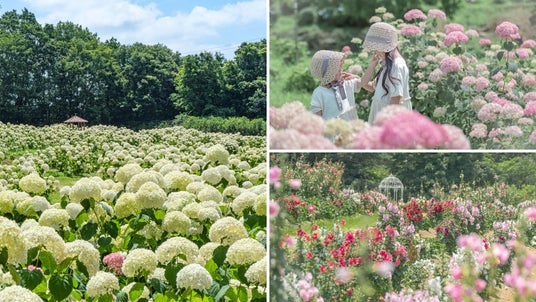 あじさいとタチアオイが同時に楽しめる丘。様々な種類のあじさいとタチアオイが高原を色づけます。