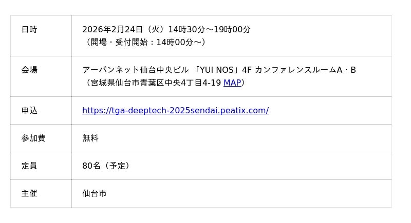 当社が受託事業者として運営事務局を務めている仙台市主催アクセラレーションプログラム「TGA~DeepTech~2025」の成長支援プログラムの成果報告会(デモデイ)を、2026年2月24日(火)に YUI NOS(仙台市青葉区)で開催いたします。