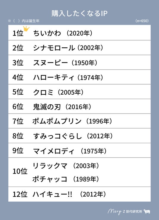 「どのようなキャラクターだと購入したくなるか」のアンケートでは、「ちいかわ」が2位の「シナモロール」を僅差で上回り、1位を獲得。キャラクターの誕生年をみると、誕生10年以内のキャラクターでランクインしたのは「ちいかわ」と「鬼滅の刃」の2作品のみで、誕生10年以上のキャラクターが上位を占める結果となった。