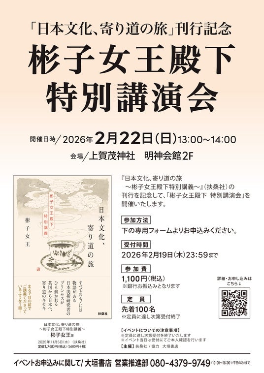 『日本文化、寄り道の旅 ~彬子女王殿下特別講義~』(扶桑社)の刊行を記念して、「 彬子女王殿下 特別講演会 」を開催いたします。