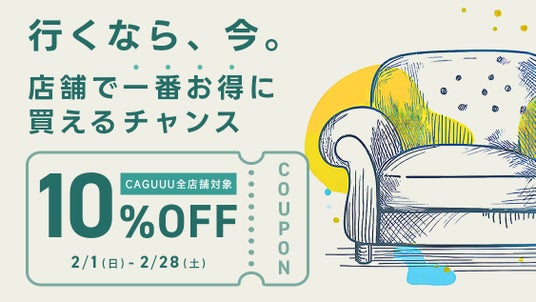 2月1日(日)~2月28日(土)の期間限定で、CAGUUU全実店舗に展示されている全商品が、表示価格から10%OFFとなります。さらに、店頭で配布する「来店者限定クーポンカード」をご利用いただくことで、オンラインでもCAGUUUが誇る3,000点以上の全ラインナップを10%OFFでお買い求めいただけます。