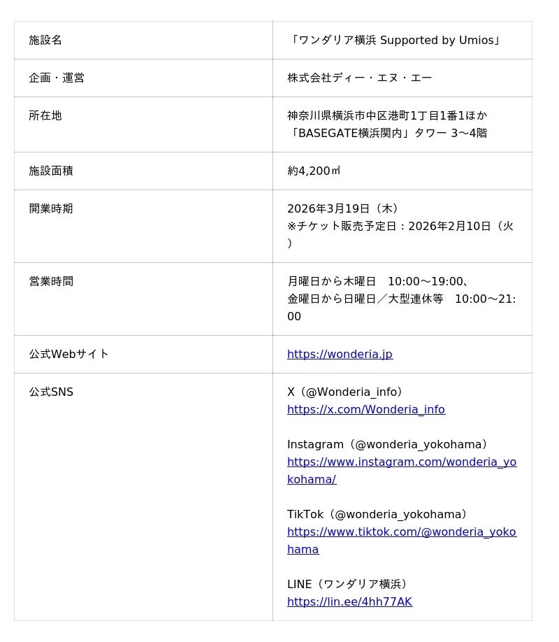株式会社ディー・エヌ・エー(本社:東京都渋谷区、代表取締役社長兼CEO:岡村信悟、以下 DeNA)は、大規模複合街区「BASEGATE横浜関内」内で企画・運営する没入型体験施設「ワンダリア横浜 Supported by Umios」(以下、ワンダリア横浜)の開業日を2026年3月19日(木)に決定しました。 これに伴い、2026年2月10日(火)より公式Webサイトにて入館チケットの販売を開始します。あわせて、未公開であったゾーン1、3、4のビジュアルおよび、アクアクララ株式会社(本社:東京都港区、代表取締役社長:藤井靖之、以下 アクアクララ)とのゾーンスポンサー契約の締結に関してお知らせします。