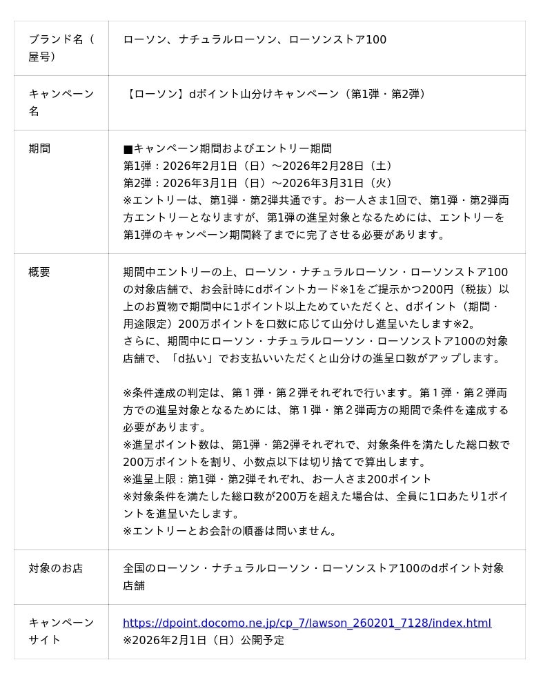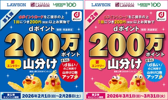 株式会社NTTドコモ(以下、ドコモ)は、ローソン・ナチュラルローソン・ローソンストア100において「【ローソン】dポイント山分けキャンペーン(第1弾・第2弾)(以下、本キャンペーン)」を、2026年2月1日(日)から2026年3月31日(火)までの期間で開催いたします。
