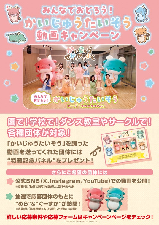 みんなで踊った動画を撮影して応募いただくと「かいじゅうたいそう特製記念パネル」を贈呈、さらに応募時のご希望に合わせて公式SNS等での動画公開や、抽選で“めら”“ぐーすか”がやってくる「みんなで踊ろう!『かいじゅうたいそう』動画キャンペーン」が開催決定、本日より募集を開始いたしました。