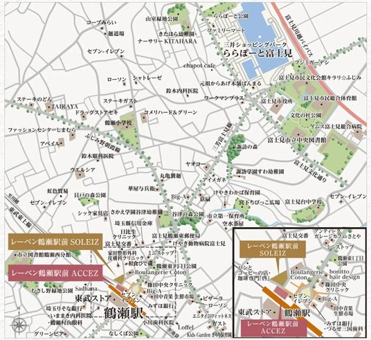 駅前の「東武ストア」や「Big-A」など3つのスーパーマーケットや徒歩1分のコンビニエンスストアが日常の買い物を支え、さらに約290店舗を誇る県内最大級※4の「ららぽーと富士見」(自転車約6分)を生活圏として使いこなせるだけでなく「イムス富士見総合病院」をはじめとする充実した医療施設や各種教育施設、そして「谷津の森公園」(徒歩6分)など季節の潤いを感じる自然環境までもが身近に揃う利便性と安らぎが高度に融合したロケーションです。※5