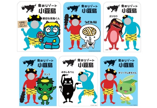小豆島の6か所に設置される鬼の顔出しパネル。赤鬼や青鬼になって写真撮影が可能