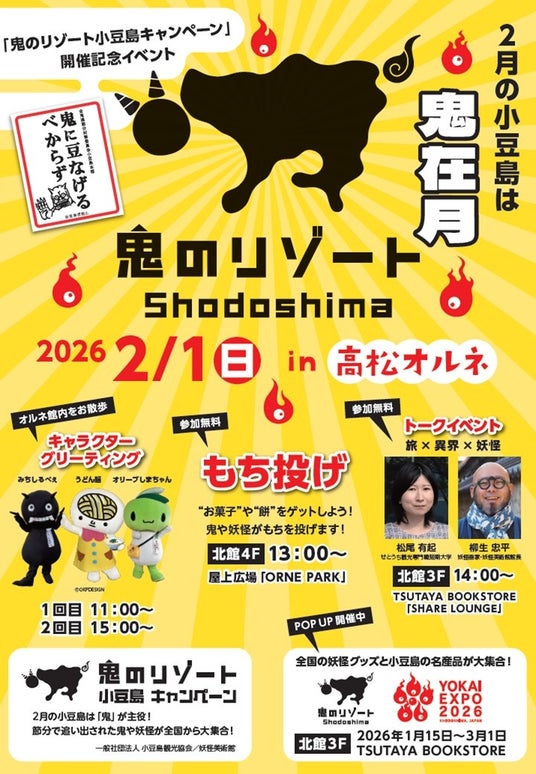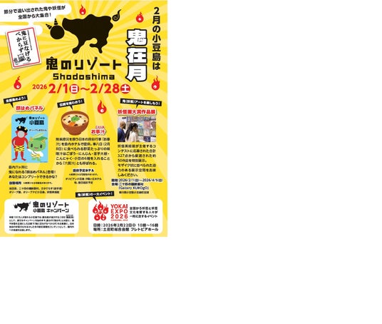 妖怪美術館(館長:柳生忠平)は小豆島観光協会と共に、小豆島の観光キャンペーン「鬼のリゾート小豆島」を2026年2月1日(日)から2026年2月28日(土)まで開催いたします。島内には鬼や妖怪の等身パネル、顔出しパネルが登場し、写真映えスポットが続々出現。また、無病息災を願う伝統行事「事八日」にちなんだ伝統食「お事汁」のふるまいも予定。妖怪アートの展覧会(二十四の瞳映画村)に加え、2月22日にはキャンペーンの集大成ともなるイベント「YOKAI EXPO 2026」を開催。2月1日にはプロモーションを兼ねたオープニング記念イベントとして、高松オルネにて節分イベントを開催いたします。