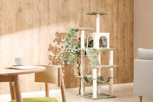 『ねこと私のくつろぎ空間』 コンセプトはねこと飼い主が一緒に癒される場所。リラックス作用のあるグリーンをキャットタワーに融合させ、癒しの場を創造しました。