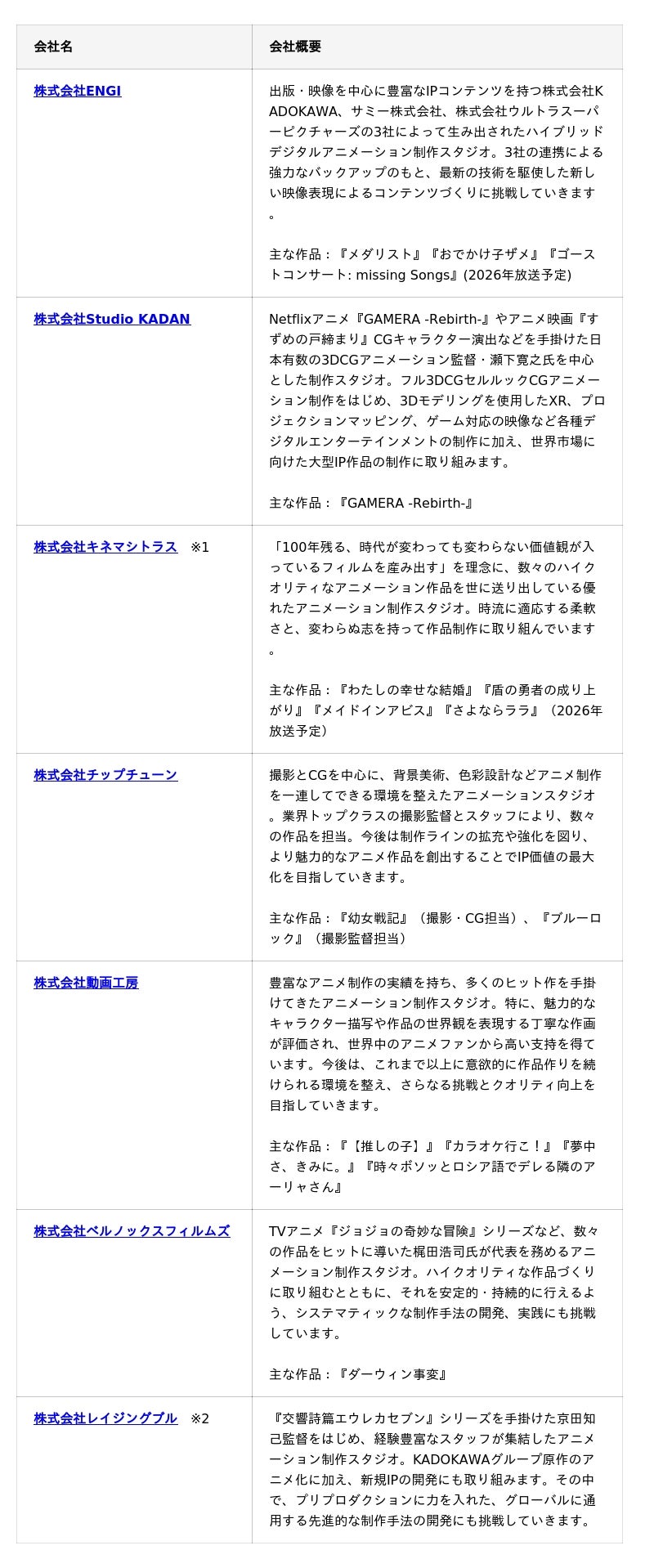 株式会社KADOKAWA(本社:東京都千代田区、取締役 代表執行役社長 CEO:夏野剛、以下 KADOKAWA)は、当社グループのアニメ制作スタジオ横断による合同リクルート「KADOKAWAグループアニメスタジオ新卒採用2027」を2026年2月より開催することをお知らせいたします。