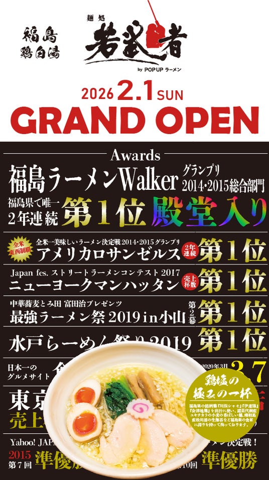 三井不動産株式会社(本社:東京都中央区、代表取締役社長:植田 俊)が開発を手掛けた「三井アウトレットパーク マリンピア神戸」が全面建替え工事を経て、2024年11月にオープン。その中に全国で展開しています「POPUPラーメン」の6店舗目として出店いたしました。2月1日から「POPUPラーメン」の第4弾として福島の食材ににこだわったラーメン店「麺処若武者 本店」が出店いたします。