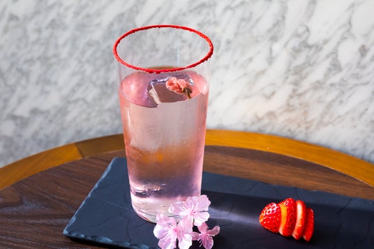 寄り添う春のロングカクテル。塩漬けの桜の花が優しい塩味と香りを添え、ドライイチゴのリムが酸味と彩りを加えます。焼酎と桜が織りなす