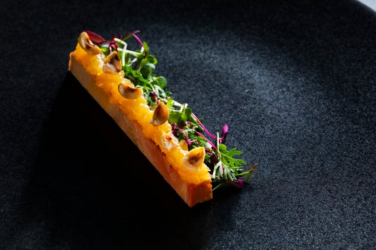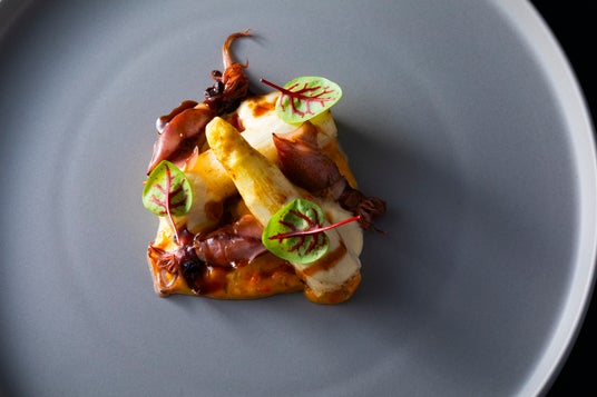 シェフが厳選した春の食材を存分に味わっていただけるシグニチャーコースメニューコースの始まりはなめらかなフォアグラテリーヌに、日向夏の爽やか酸味とほのかな苦みを添えた一皿。濃厚でリッチな味わいのフォアグラテリーヌに、絶妙な酸味と清涼感を合わせたコントラストをご堪能ください。