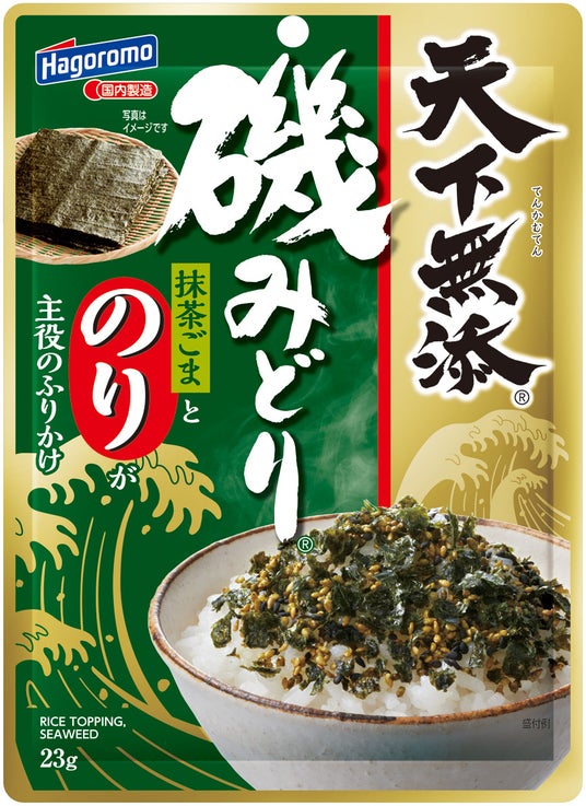 『天下無添 磯みどりふりかけ』もパッケージデザインを変更します。のりと当社オリジナルの「抹茶ごま」を使用し、風味豊かな味わいが特長の製品仕様が伝わるデザインにしました。