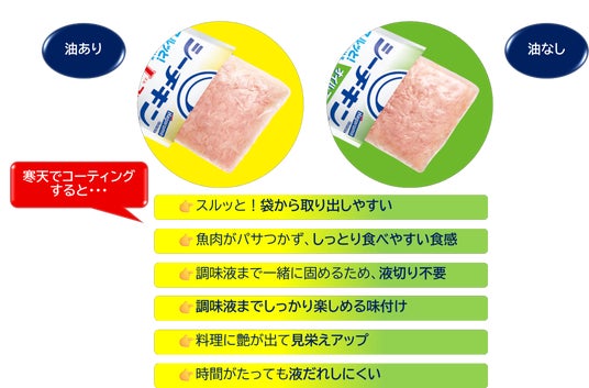 寒天でコーティングすることで魚肉がパサつかず、しっとり食べやすい食感になります。また調味液まで一緒に固めるため、調味液までしっかり楽しめる味付けに仕上げました。寒天で魚肉に艶感が出ることで、料理の見栄えもアップ。時間がたっても液だれしにくいなど、いいこと尽くしで使い方がさらに広がります。今回は、きはだまぐろを使用し、油ありの「シーチキン スルッと!Smile Lフレーク」と、油なしの「シーチキン スルッと!Smile オイル不使用Lフレーク」の2種類を発売します。