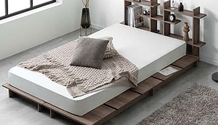 サイドにゆとりを生むステージベッドは、マットレスよりも一回り大きいことから空間におしゃれな印象を与えることができる。マットレスを設置する際には、中央もしくは端寄せと2パターンの使い方ができるので気分に合わせて変えることも可能。また、高さを抑えたロースタイルにすることで部屋をすっきりみせることができる。空間にゆとりが生まれ、開放感のある印象にすることができる。