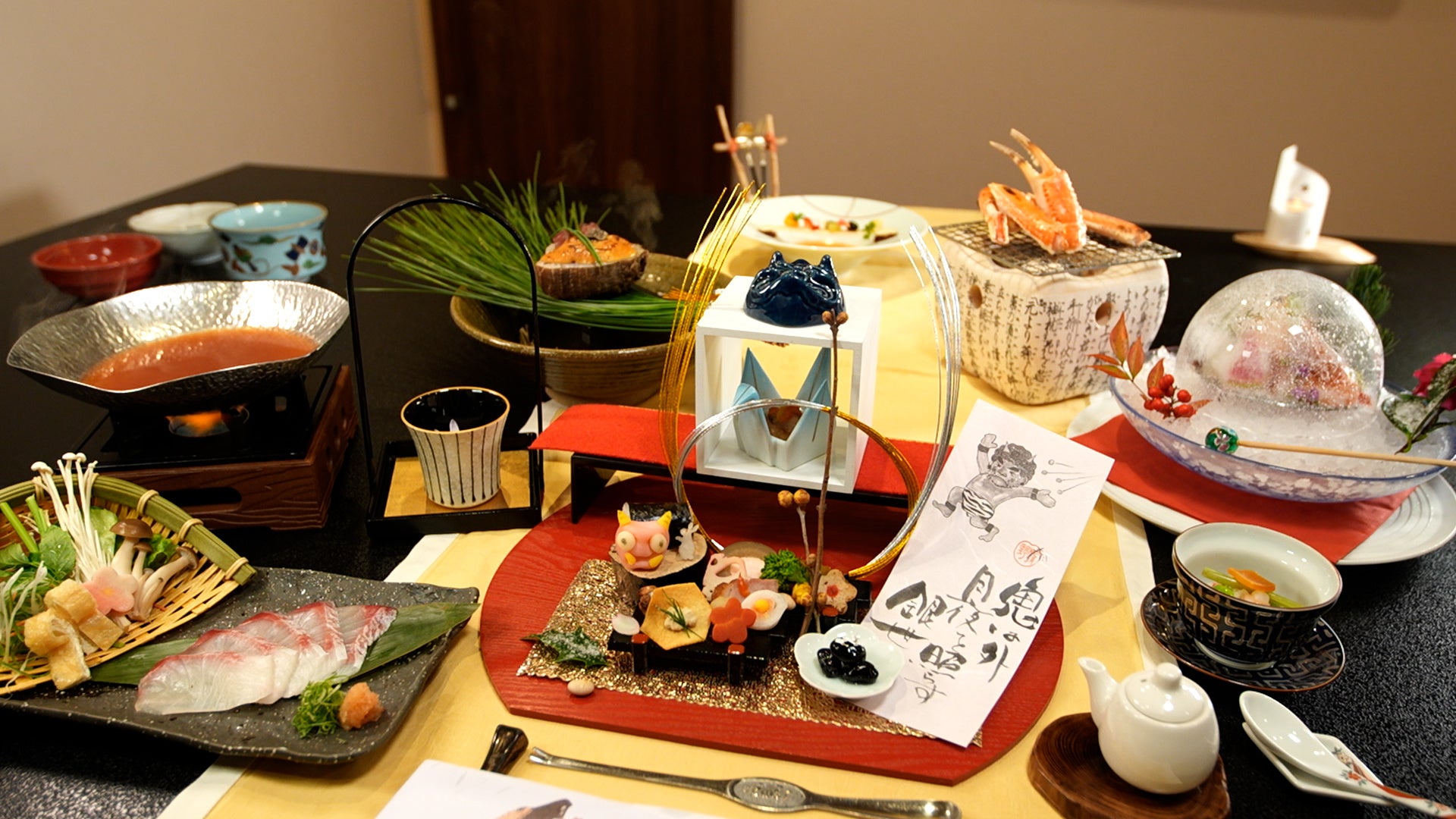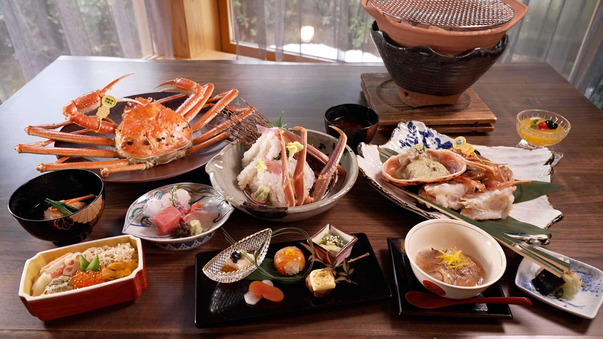 こだわりの一つが、京都の老舗料亭で修行を積んだ7代目自らが調理するという、加能ガニという雄のズワイガニを使用したカニのフルコース!魚屋からではなく、橋立漁港の競りに参加する権利を持つという、仕入れ方までゴージャスな、最高の料理を堪能できます。