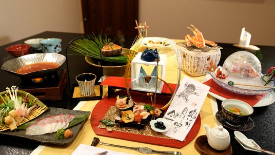 天守閣のような外観が湯村温泉全体のシンボルにもなっている旅館。こちらでは、そんなたっぷりのお湯を贅沢に楽しめるだけでなく、日本海の恵、寒ブリのしゃぶしゃぶにカニやシャトーブリアン、氷のドームを割って食べるお刺身など、遊び心も加わった懐石料理を堪能できます。