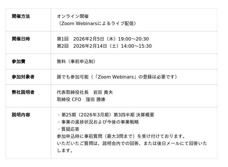 本説明会では、当社代表取締役社長および取締役CFOが登壇し、決算内容のポイントや事業の進捗、今後の成長戦略について分かりやすくご説明するとともに、質疑応答の時間も設けております。