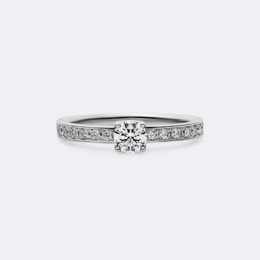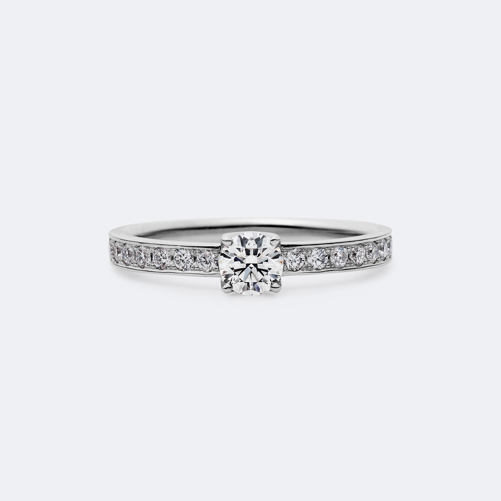 ヴァンドーム青山で永く愛される4本爪のシリーズの石座を、「永遠」を意味するエタニティタイプのアームにあしらった、シンプルかつラグジュアリーで正統感溢れるエンゲージメントリング。