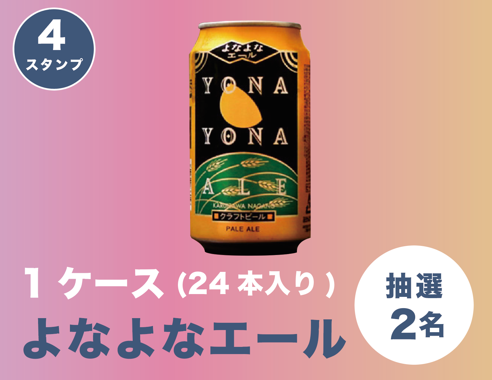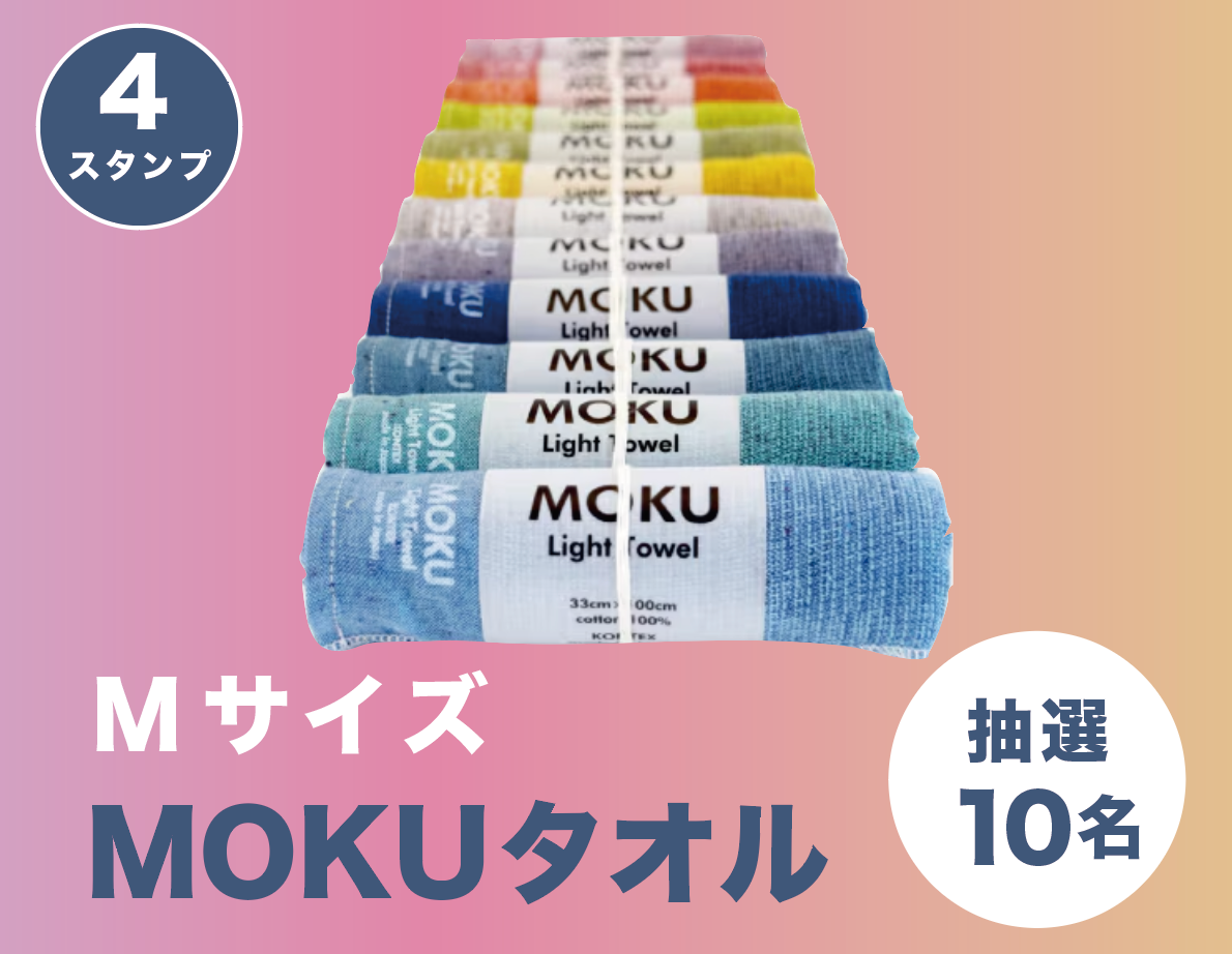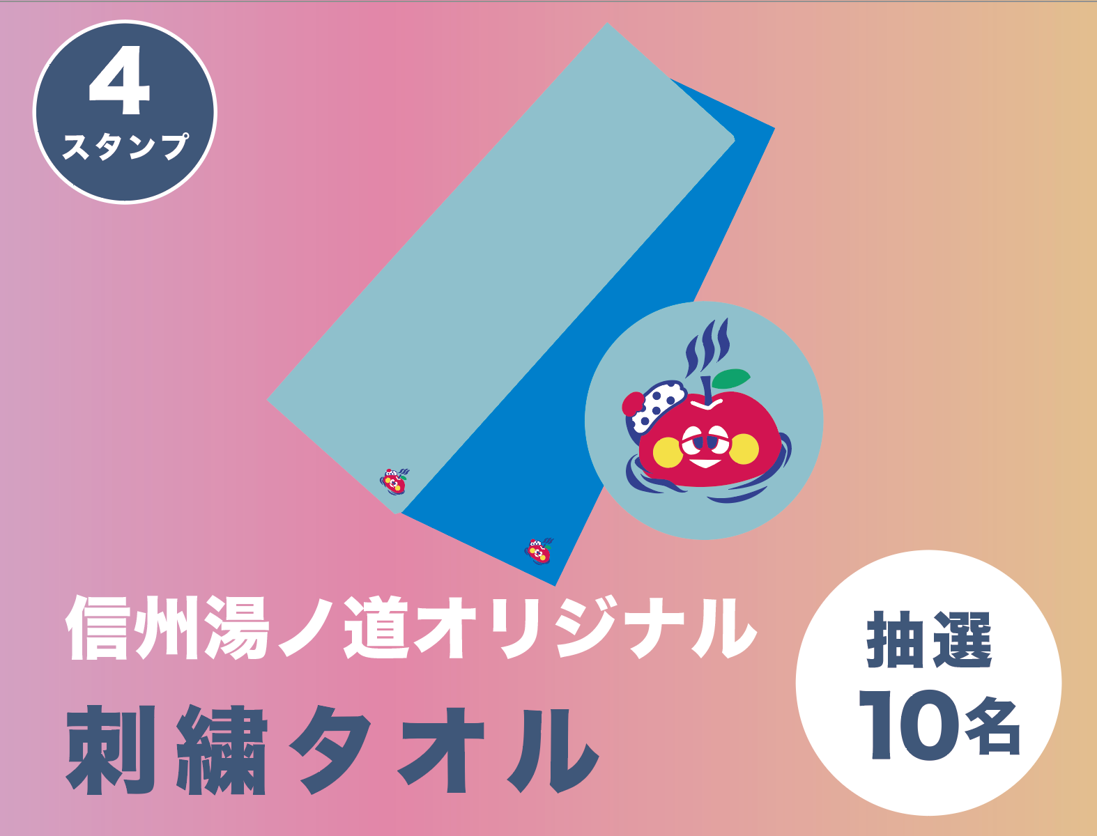 4スタンプ獲得で、MOKUタオル、よなよなエール1ケース(24本入り)、オリジナル刺繍タオル、オリジナルソックス、温泉無料券セット、メッシュおふろトートなどが抽選で当たります。長野県ならではの商品も追加準備中です。