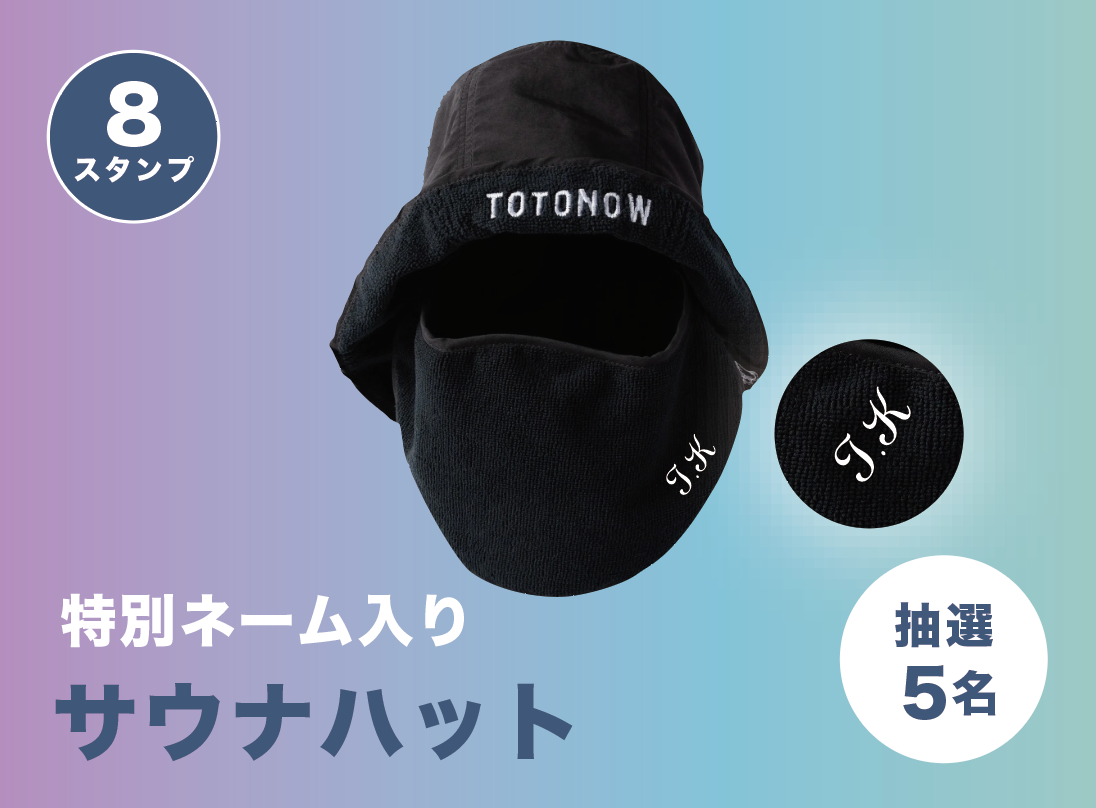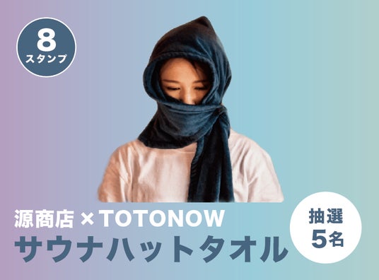 8スタンプ獲得すると、あなただけの特別ネーム刺繍入り限定サウナハット、または口元もカバーできる源商店サウナハットタオル[TOTONOWモデル・非売品] が抽選で当たります。