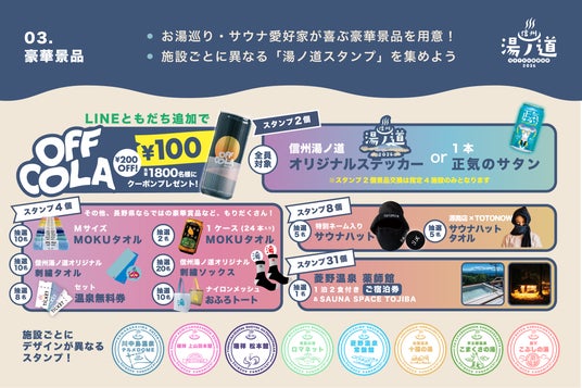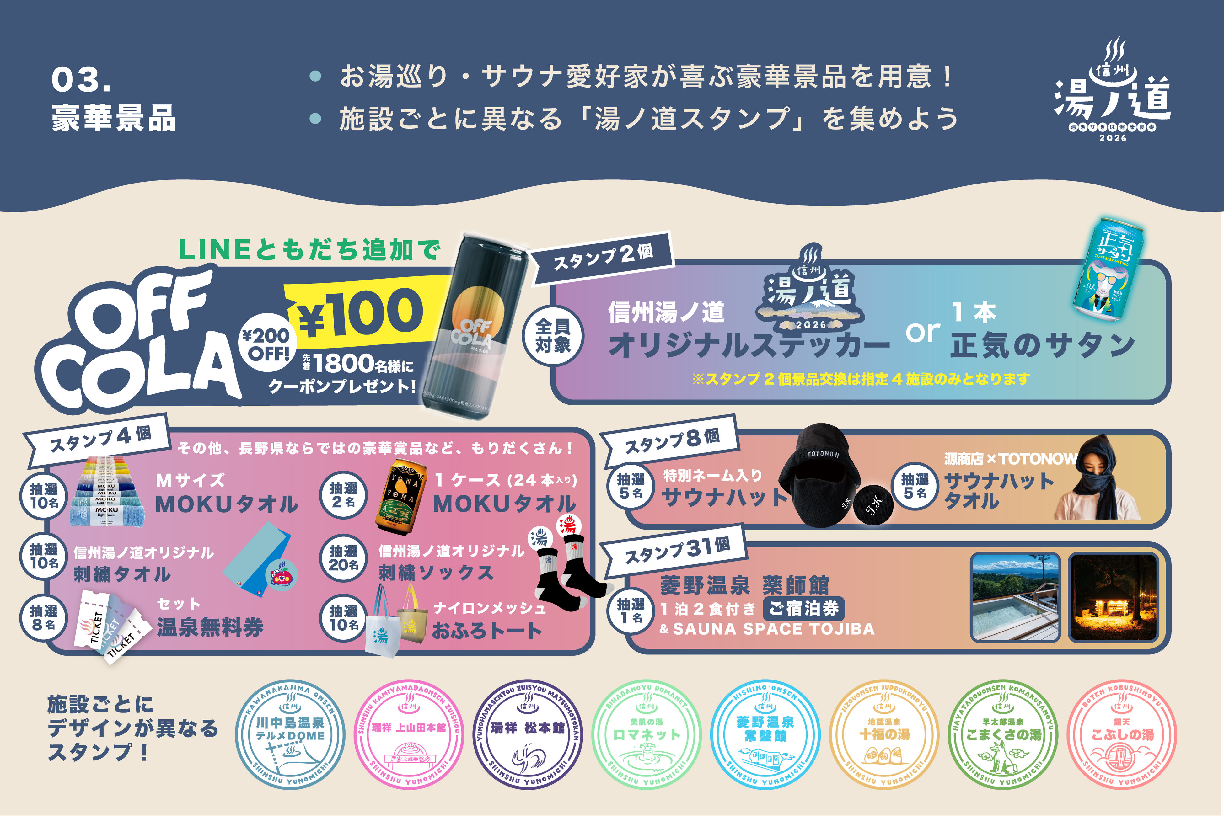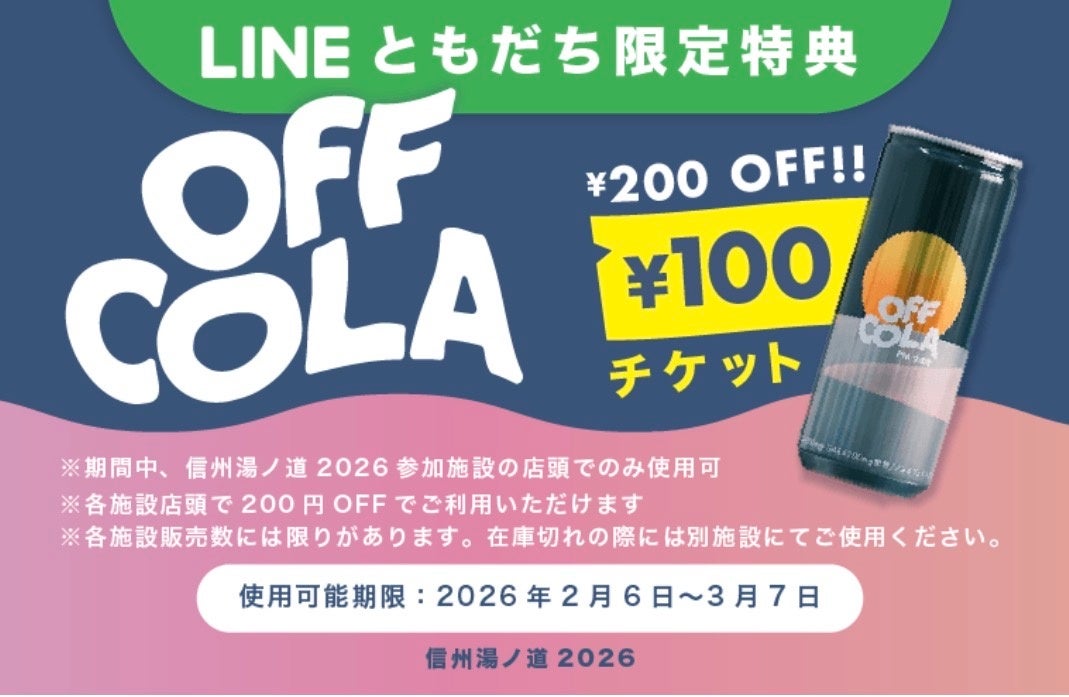 スタンプ獲得数に応じて景品の内容が変わります。条件をクリアする度に、信州湯ノ道公式LINE内に自動的にクーポンや応募フォームが届くというシンプルな運用で応募も簡単です。【LINEともだち特典】OFF COLA 割引クーポンをプレゼント(先着1,800名様)