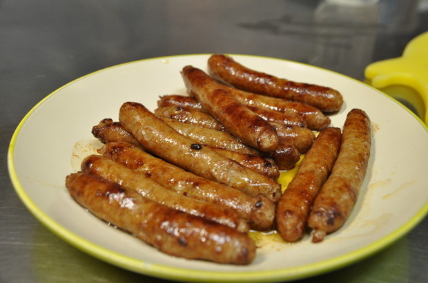 ソーセージから脂が出るので決してフライパンに油を入れないこと。余分な油を吸ってしまう。そして強火。焦げ目は結構なくらいに付ける。その後、弱火に。