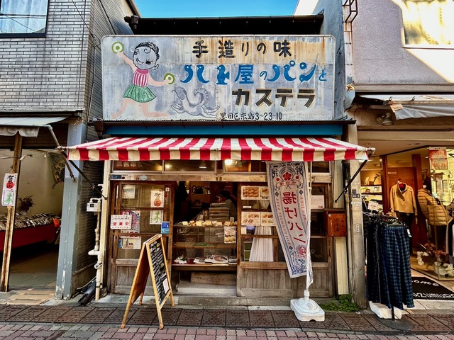 店は京成曳舟駅から徒歩7分の「下町人情キラキラ橘商店街 」のなかほどにあった。懐かしい佇まいと、風情がある看板が特徴のパン屋だった。看板には、ドーナツのようなものを持つ女の子と犬と「ハト屋のパンとカステラ」の文字が描かれている。