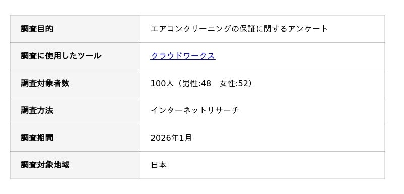 おうちにプロでは、エアコンクリーニングでお悩みの方により有益な情報を提供するために、「エアコンクリーニングの保証に関する独自調査」を実施しました。アンケート調査の概要は以下の通りです。