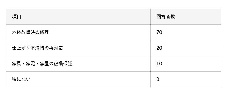 - 保証内容で最も重視されているのは「本体故障時の修理」。