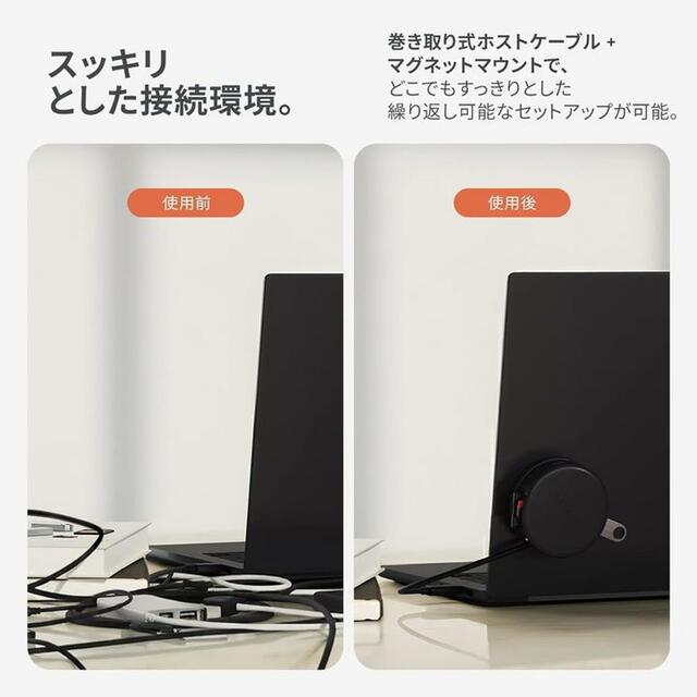 最後に挙げたいのは、デスクとバッグで「省スペース」が叶う点。巻き取り式USB-Cケーブルと磁石マウントによって、ケーブルが本体にシュルッ、ピタッと収納できる独自設計です。