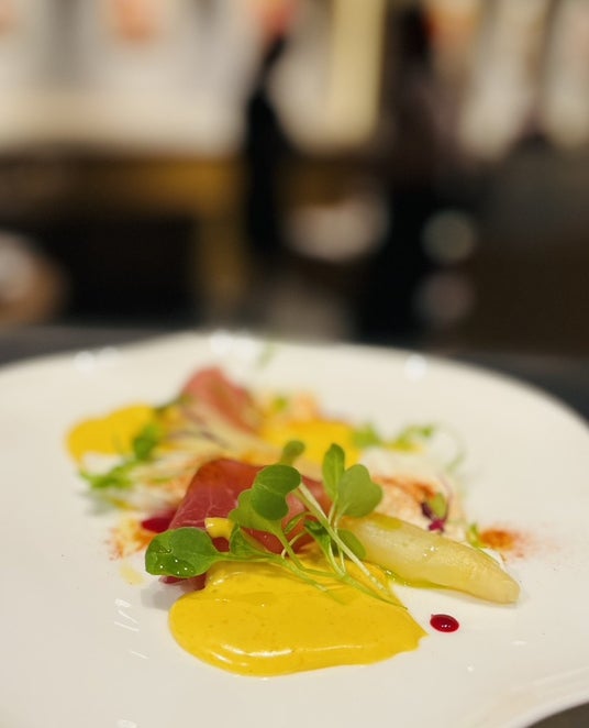 旬を迎えるホワイトアスパラガスに、生ハムと削ったパルメザンを重ね、ふんわりとしたオレンジと卵黄のソースで春の光を添えた、「けしき春日和」を表現した一皿です。