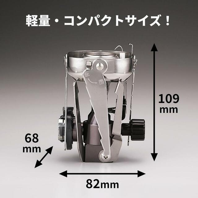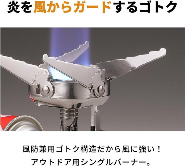 燃料は入手性の高いカセットガス式。ワンプッシュ自動点火で扱いやすく、風防兼用ゴトク構造により屋外でも安定した燃焼を提供してくれます。