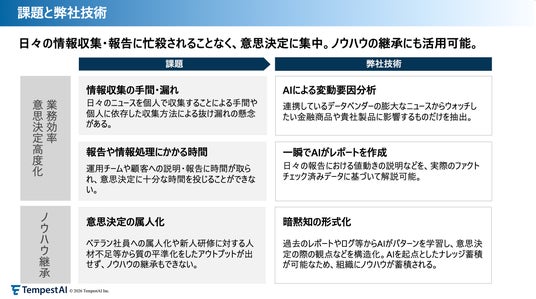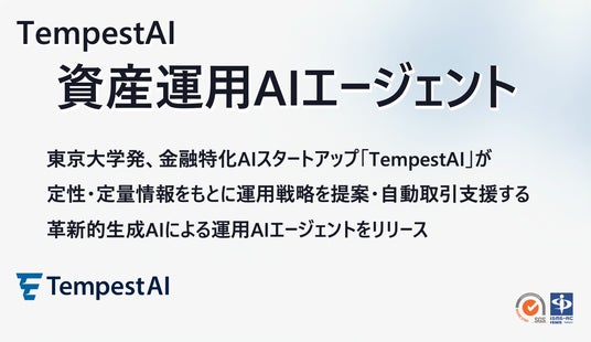 TempestAI株式会社(本社:東京都渋谷区、代表取締役CEO:池田 蒼 技術顧問:松尾研究所副社長 金剛洙)は、生成AIと時系列解析・クオンツモデルを統合し、日々のニュースや市場環境を踏まえた投資判断を支援する「資産運用AIエージェント」を正式にリリースいたしました。