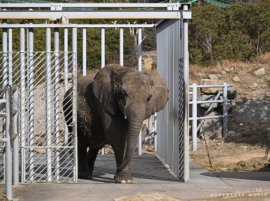 アフリカゾウが寝室から運動場へ出てくる様子