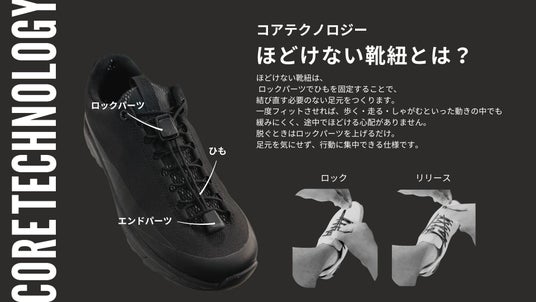 独自のロック機構により、結ばず・ほどけず、足元の不安とストレスを軽減するフットギアです。