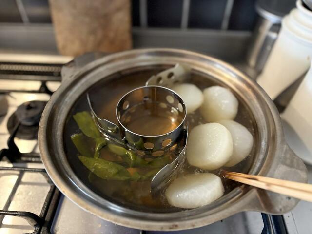 おでんの鍋は底が平らだったため仕切りが安定しましたが、土鍋は丸底なのでズレやすい点は注意が必要でした。