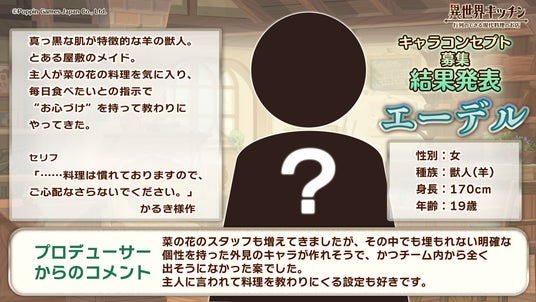 スマートフォンゲーム『異世界キッチン 行列のできる現代料理のお店』は、「第1回キャラクターコンセプト募集」の結果を発表いたします。