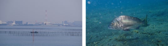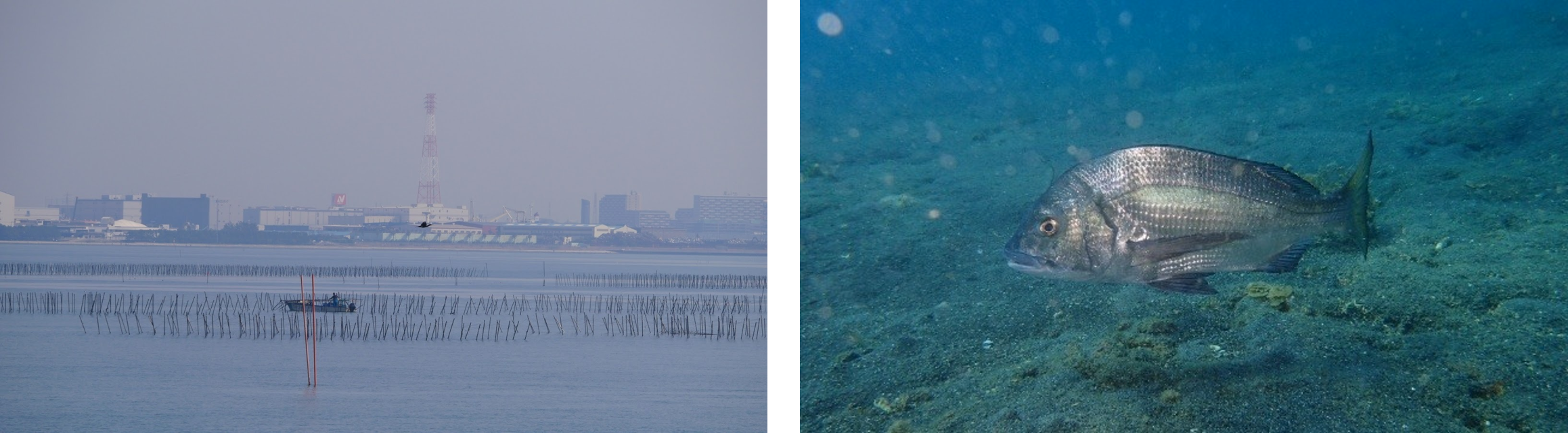 ▲東京湾の海苔養殖の様子(左)、回遊するクロダイ(右)