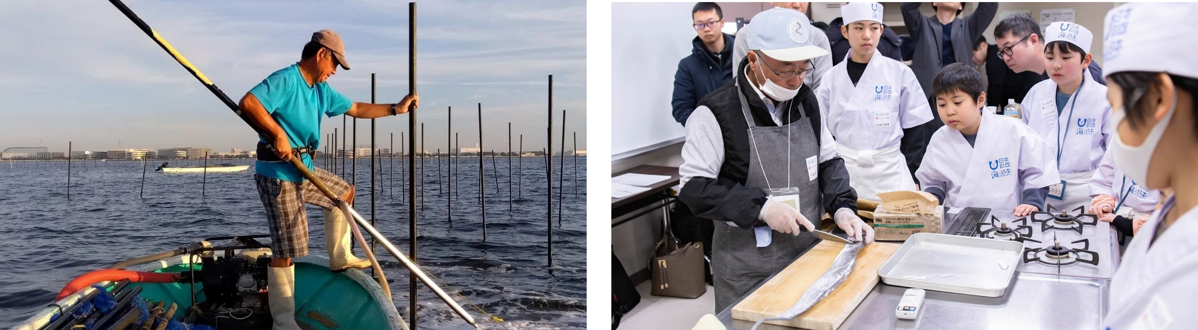 ▲海苔養殖場の棒たてを行う福田武司氏(左)と、魚のさばき方を教える澤田洋一氏(右)