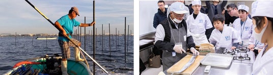 市川市漁業協同組合の協力のもと、東京湾と真正面から向き合う体験を提供します。海苔の日本三大漁場の一つである東京湾へ船で出航し、海上で行われる海苔養殖の現場を間近に見学。あわせて、陸上では海苔の摘み取りを体験します。さらに、停船中の底引き網漁船を見学し、前日に水揚げされた底引き網漁の漁果を確認しながら、貝の選別工程にも触れます。料理に至る前段階にある「獲る」という営みを、知識ではなく身体感覚として捉える機会となります。