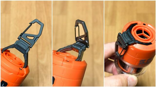 上部には自由に動かすことができるカラビナ型フックが付いているので、テントやタープへの設置も楽ちん。